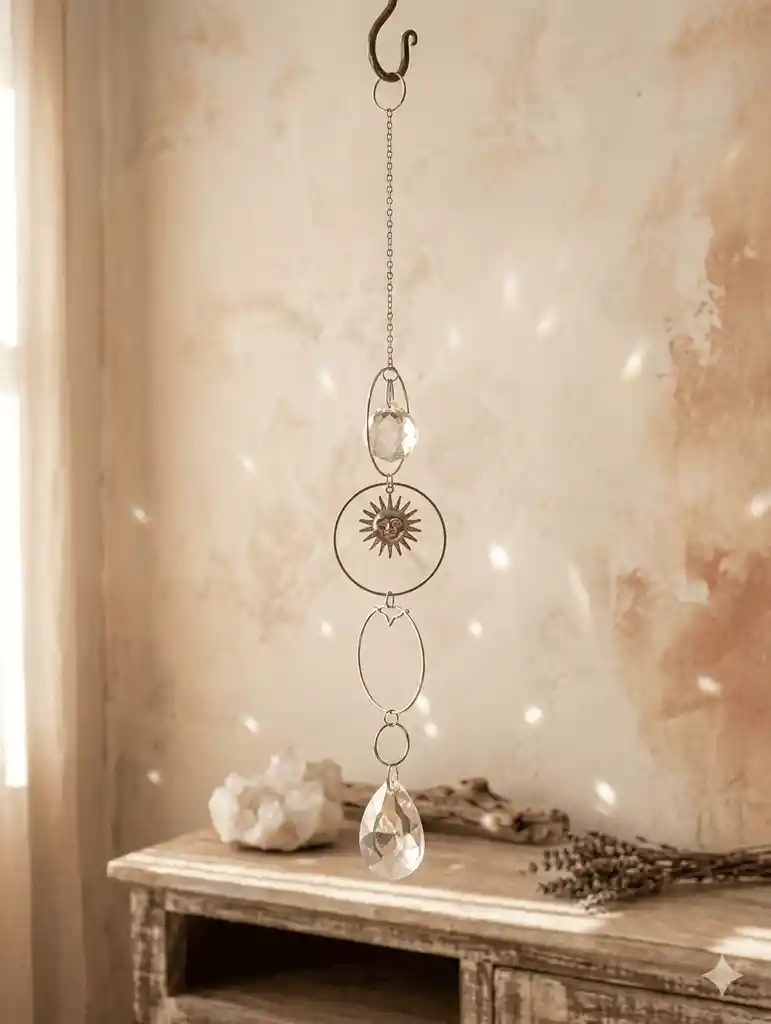 Atrapasol con cristales y dije de sol. Energéticos y bonitos.