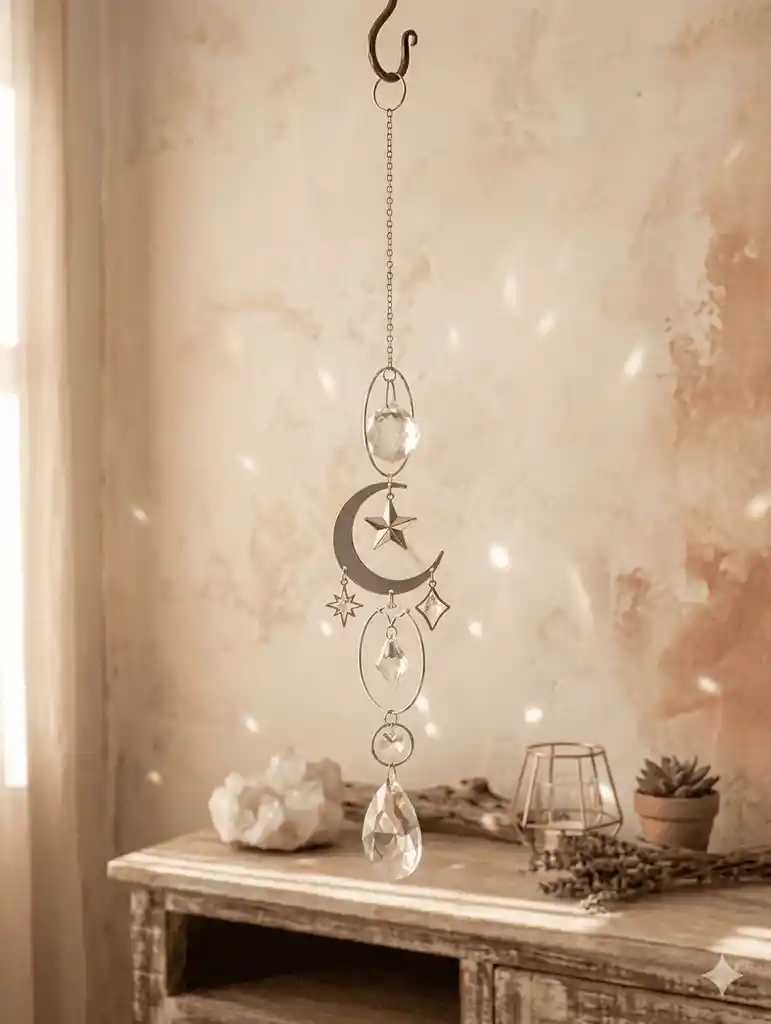 Atrapasol con cristales y dije de Luna. Energéticos y bonitos.