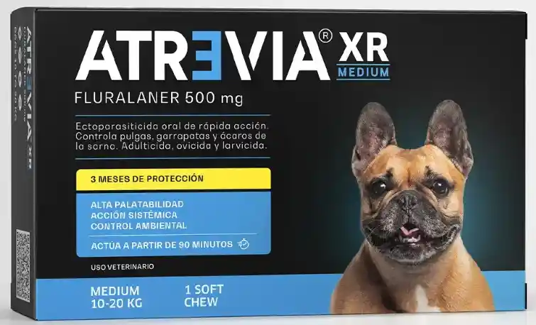Atrevia® XR Medium otorga un efectivo tratamiento ectoparasitario sistémico contra pulgas, garrapatas y ácaros, en base a fluralaner, que protege a los perros por 3 meses. Puede utilizarse en animales infestados o como preventivo. Empieza su acción en 90 minutos y mata a las pulgas en 8 horas y a las garrapatas en 12 horas.