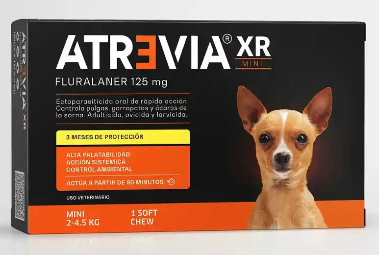 Atrevia® XR Mini otorga un efectivo tratamiento ectoparasitario sistémico contra pulgas, garrapatas y ácaros, en base a fluralaner, que protege a los perros por 3 meses. Puede utilizarse en animales infestados o como preventivo. Empieza su acción en 90 minutos y mata a las pulgas en 8 horas y a las garrapatas en 12 horas.