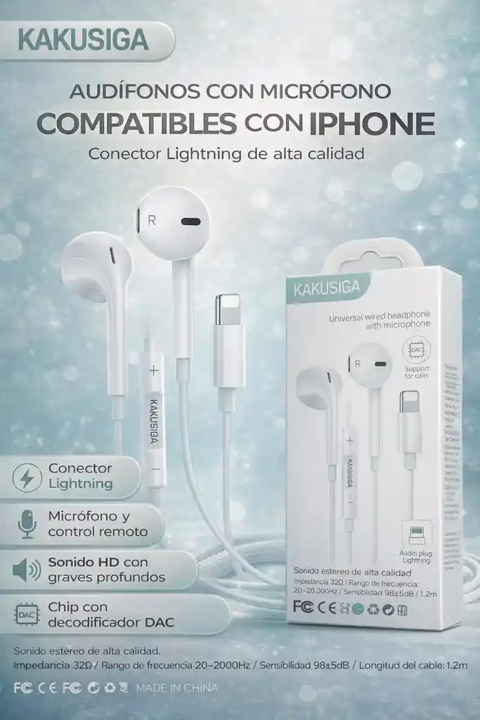 ¡Disfruta de una experiencia auditiva increíble con nuestros audífonos Lightning para iPhone! 🎧✨ Estos audífonos ofrecen sonido HD con graves profundos para disfrutar de cada nota de tus canciones favoritas, hacer videollamadas con claridad o jugar sin perderte de ningún detalle. 🖤 Con un micrófono integrado y control remoto fácil de usar, este dispositivo se convierte en una opción ideal para todas tus necesidades de audio. Además, su conector Lightning asegura una compatibilidad total con tu iPhone. Características destacadas: Sonido HD para una calidad superior. Micrófono integrado para llamadas claras. Control remoto fácil de usar. Conector Lightning de alta calidad. Chip DAC para optimizar la calidad de audio. Longitud del cable: 1.2 metros. Rango de frecuencia: 20-20000Hz. Sensibilidad: 98±5dB. Diseño ergonómico para un ajuste cómodo y seguro. Ideal para música, videollamadas, y juegos. Con estos audífonos, cada momento será único. 😎🎵 Lleva tu sonido a otro nivel y haz que cada llamada o canción sea más nítida y clara. ¡Conéctalos y disfruta de la mejor calidad de audio!