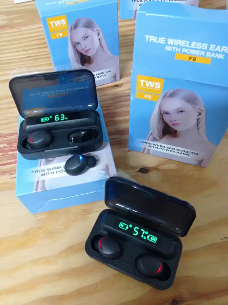 Los audífonos F9 son bluetooth, recargables con una duración entre 1 y 3 horas en uso continuo dependiendo el volumen con el que los escuchas, caja con indicador de batería, función power bank, viene con cable de carga cada par.