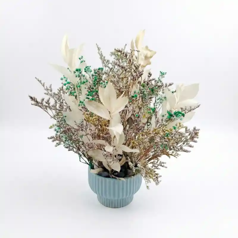Este florero escultura es una pieza que transforma el espacio desde la calma y la armonía. Su base de cerámica acanalada, de diseño limpio y contemporáneo, sostiene una composición floral preservada de alto volumen, creada para aportar ligereza visual, textura y sofisticación sin exceso. Tiempos de entrega: de 1 a 4 días según disponibilidad de flores