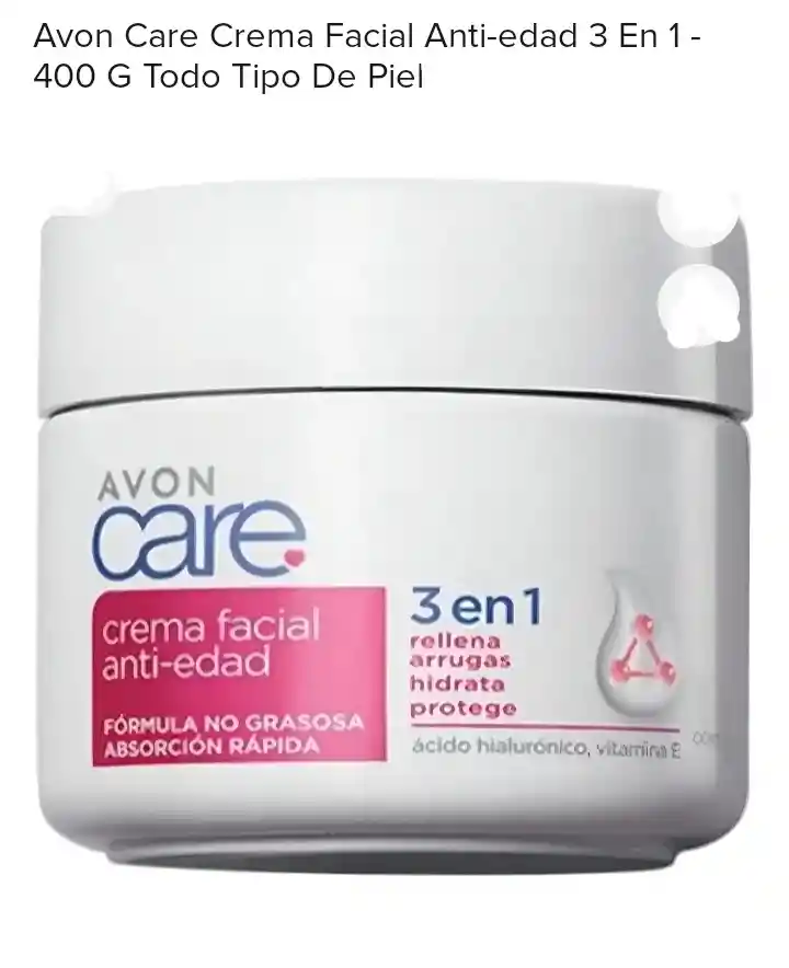 Esta innovadora fórmula 3 en 1 no solo reafirma y protege tu piel de las agresiones externas, sino que también la hidrata profundamente, difuminando líneas finas y arrugas para una elasticidad y firmeza inigualables. Enriquecida con la potencia del ácido hialurónico, que retiene la humedad para una suavidad duradera, y la Vitamina E, un escudo antioxidante contra el daño oxidativo, tu piel se sentirá renovada y protegida día tras día. Además, restaura la barrera de la piel contra las agresiones externas, defendiendola del estrés ambiental y los radicales libres Ideal para todo tipo de piel, su textura ligera y de rápida absorción la convierte en el complemento perfecto para tu rutina diaria, tanto de día como de noche. Presentada en un generoso envase de 400 gramos, esta crema antiarrugas hipoalergénica y libre de parabenos ha sido dermatológicamente testeada para asegurar el máximo cuidado y respeto por tu piel. Descubre el poder de una piel suave, flexible y luminosa con Avon Care. ¡No esperes más para experimentar la transformación! Especificaciones: -Contenido: 400 gr. -Piel: Todo tipo de piel. -Ingredientes: Con ácido hialurónico y Vitamina E. -Hipoalergénico. Libre de parabenos. -Está dermatológicamente testeado. -Momento De Aplicación: Día/Noche.