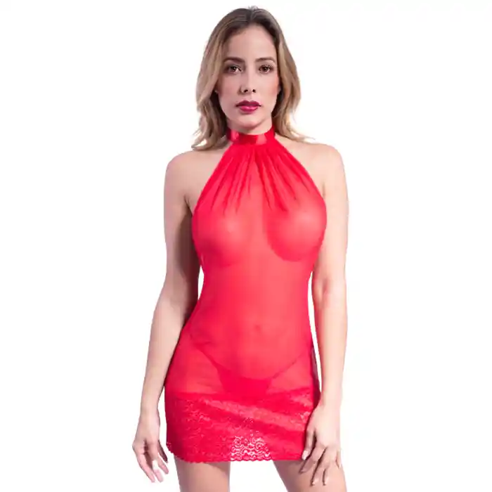 Baby doll rojo en encaje y transparencia, con espalda descubierta, incluye panty. Talla única.