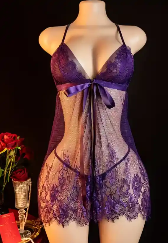 Talla M / L, la tela es elástica. Modelo 6. Conjunto de babydoll lencería para dormir elegante con encaje. Camisola malla de encaje abertura a la mitad y tanga hilo con encaje. Color Uva. Diseño romántico con detalles de encaje, ropa de dormir romántica | Tela de encaje | Tela de poliéster.