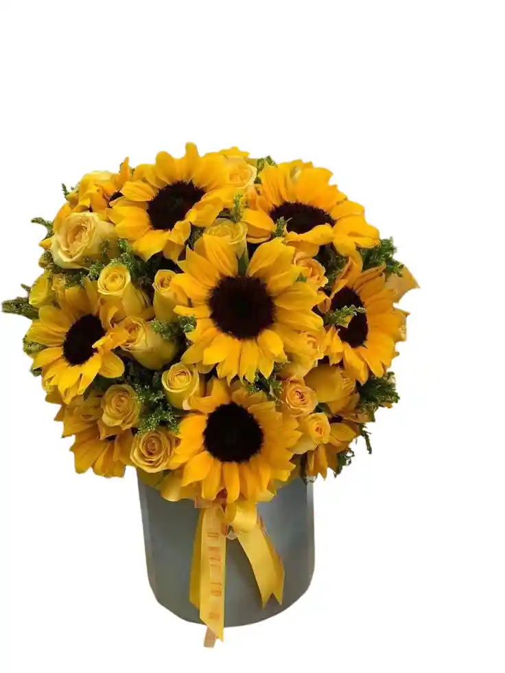 Caja de 4 girasoles aproximadamente con rosas amarillas. La flor puede ser sustituida dependiendo la disponibilidad de color y del producto “Mensaje Personalizado” máximo de 30 caracteres (Dejar el mensaje en el chat, los comentarios no se previsualizan para la tienda por lo que si se dejan allí no podrá ser incluido).