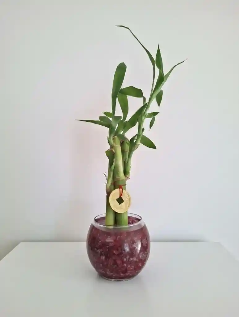 Adorno de vidrio de 6 cm (8 cm de contorno) con 3 varas de bambú (10-15 cm), gemas, cordón rojo y moneda china.