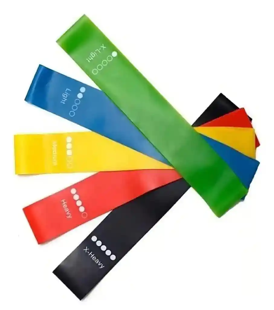 Bandas Planas Elásticas Cerradas Set x 5 Bandas de calidad premium y cinco diferentes niveles de resistencia Material: Látex. Contiene cinco bandas: Una Banda Verde: Medidas: 30 X 8 cm. Resistencia: Baja. Una Banda Azul: Medidas: 30 x 8 cm. Resistencia: Media Baja. Una Banda Amarilla: Medidas: 30 x 8 cm. Resistencia: Media. Una Banda Roja: Medidas: 30mx 8 cm. Resistencia: Media Alta. Una Banda Negra: Medidas: 30 x 8 cm. Resistencia: Alta. Las Bandas Planas Elásticas Cerradas son ideales para Terapia y Tonificación. Resistencia Efectiva para el fortalecimiento muscular, tonificación y entrenamiento de movilidad.