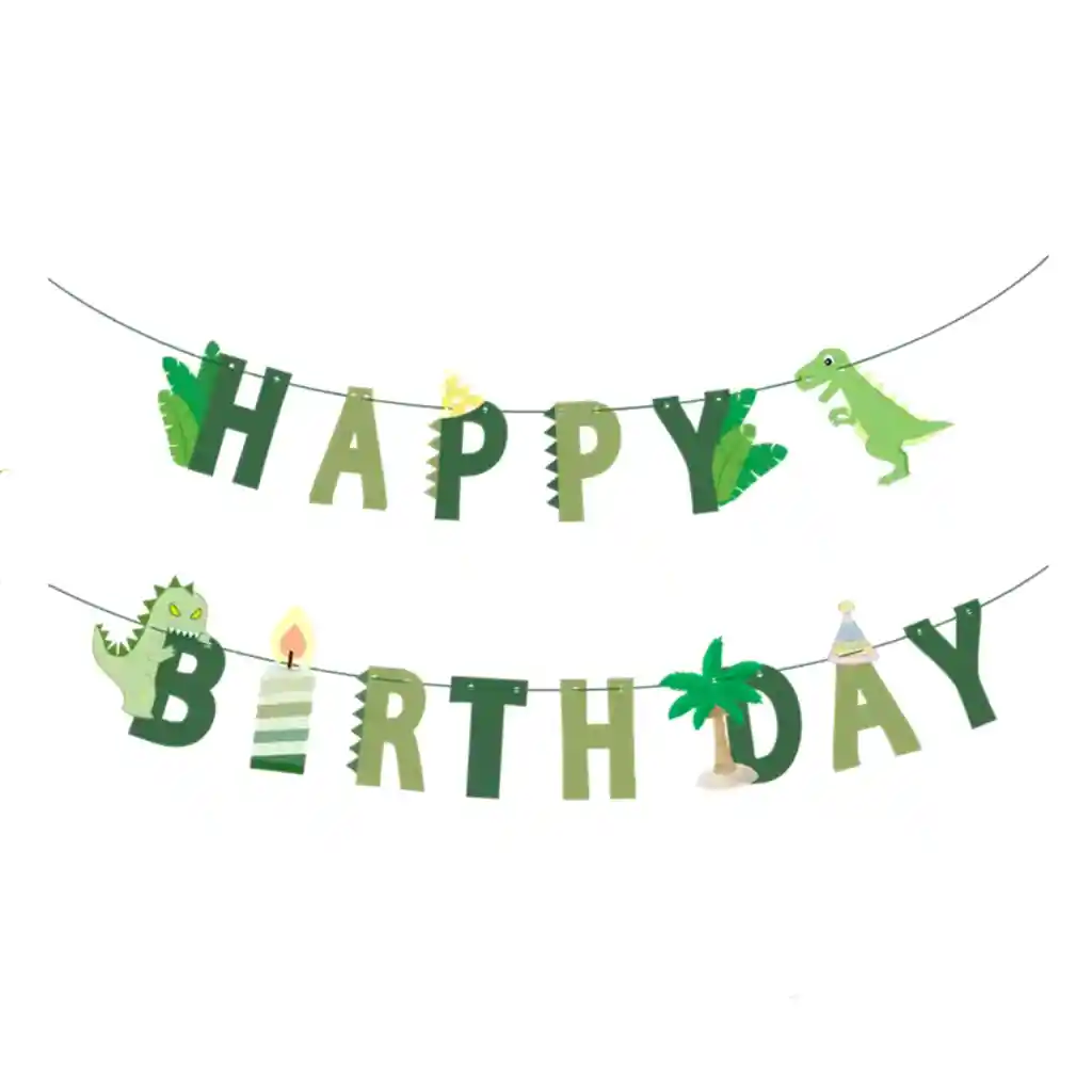 Banderín de feliz cumpleaños con temática de dinosaurio.