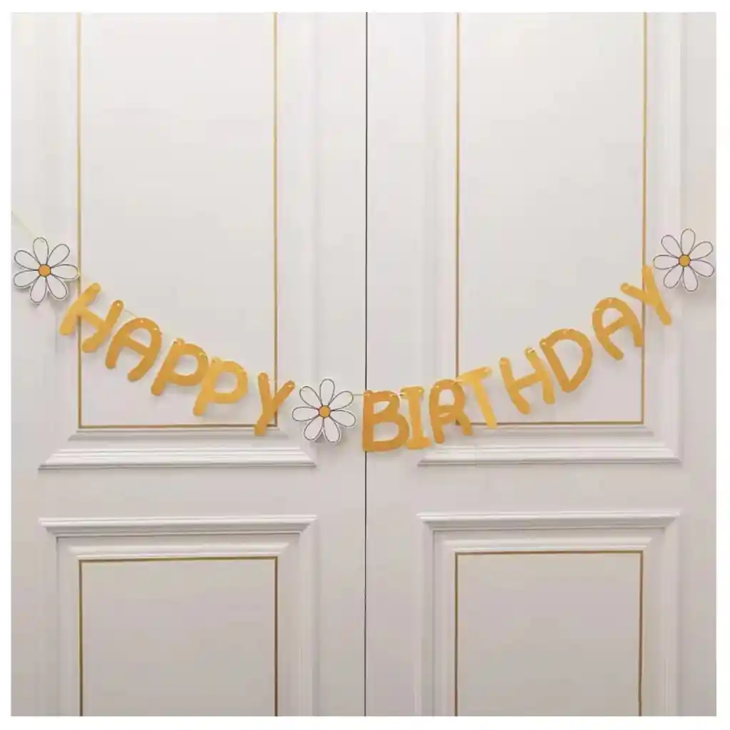 Banderín Cumpleaños Margarita y Letras Amarillas Decora tu celebración con este hermoso banderín de cumpleaños, diseñado especialmente para darle un toque alegre y natural a tus eventos. Con un elegante diseño en cartón que combina flores blancas y letras amarillas vibrantes que dicen "Happy Birthday", este banderín es perfecto para crear un ambiente festivo y lleno de vida. Características principales: - Material: Cartón resistente, ideal para uso en interiores y eventos familiares. - Diseño: Flores blancas delicadas junto a letras amarillas que resaltan la alegría del cumpleaños. - Fácil de colgar: Incluye cuerda para que puedas instalarlo rápidamente donde prefieras. Este banderín es ideal para cumpleaños o fiestas temáticas donde quieras destacar la frescura y la calidez que solo una decoración bien pensada puede aportar. Su combinación de colores y motivos florales lo hace versátil y encantador. Recomendaciones de uso: Coloca el banderín en la pared principal, sobre la mesa de dulces o en la entrada para recibir a tus invitados con una sonrisa. Es un detalle sencillo que transformará cualquier espacio en un lugar especial para celebrar. Haz que cada cumpleaños sea inolvidable con este banderín que mezcla tradición y estilo, pensado especialmente para alegrar tus momentos más queridos. ¡Celebra con estilo y calidez con nuestro banderín de cumpleaños margarita y letras amarillas!