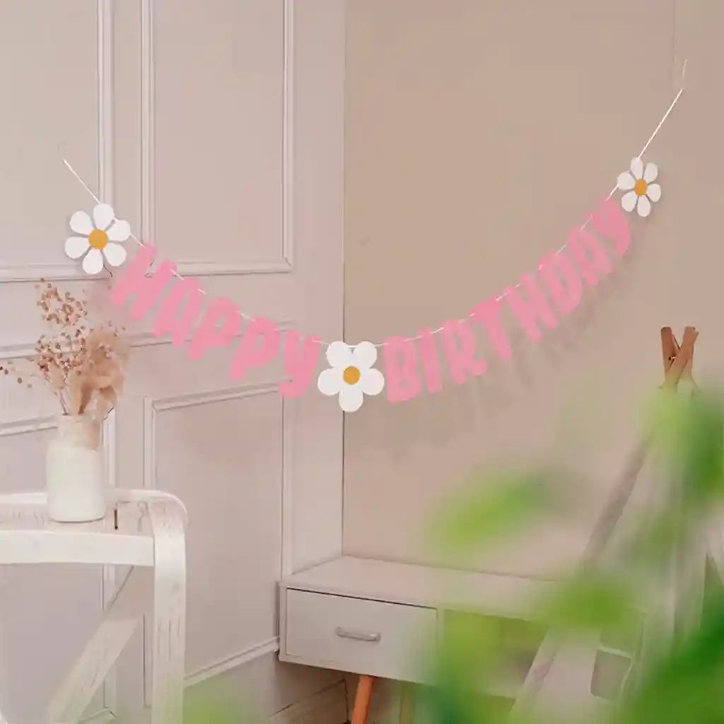 Banderin cumpleaños happy birthday, flores blancas y letras rosa
