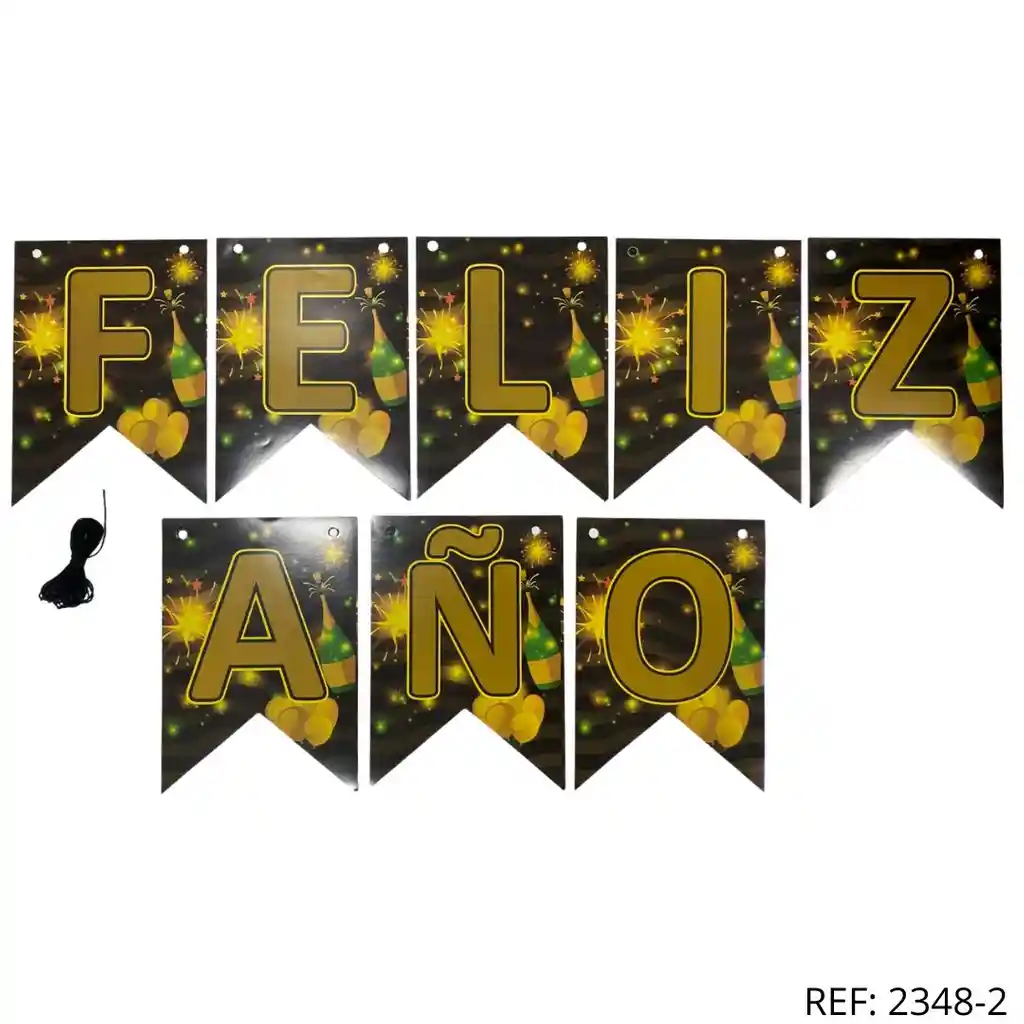 Banderín decorativo “Feliz Año Nuevo”, elaborado en cartón con letras doradas y detalles de botellas de champán. Ideal para decorar y ambientar fiestas de Nochevieja o Año Nuevo