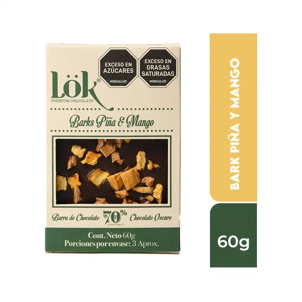 Bark de chocolate 70% contenido de cacao con piña y mango deshidratado. La esencia de la piña y el mango combinan a la perfección con el chocolate 70% cacao, exaltando todos los sabores tropicales en un solo producto. Apto para veganos y celíacos. Naturalmente libre de gluten.