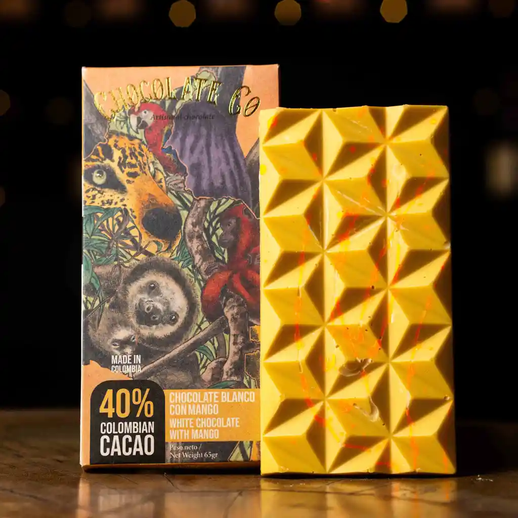 Barra artesanal de chocolate blanco con mango fabricada con cacao de la costa colombiana originado de los Montes de María.