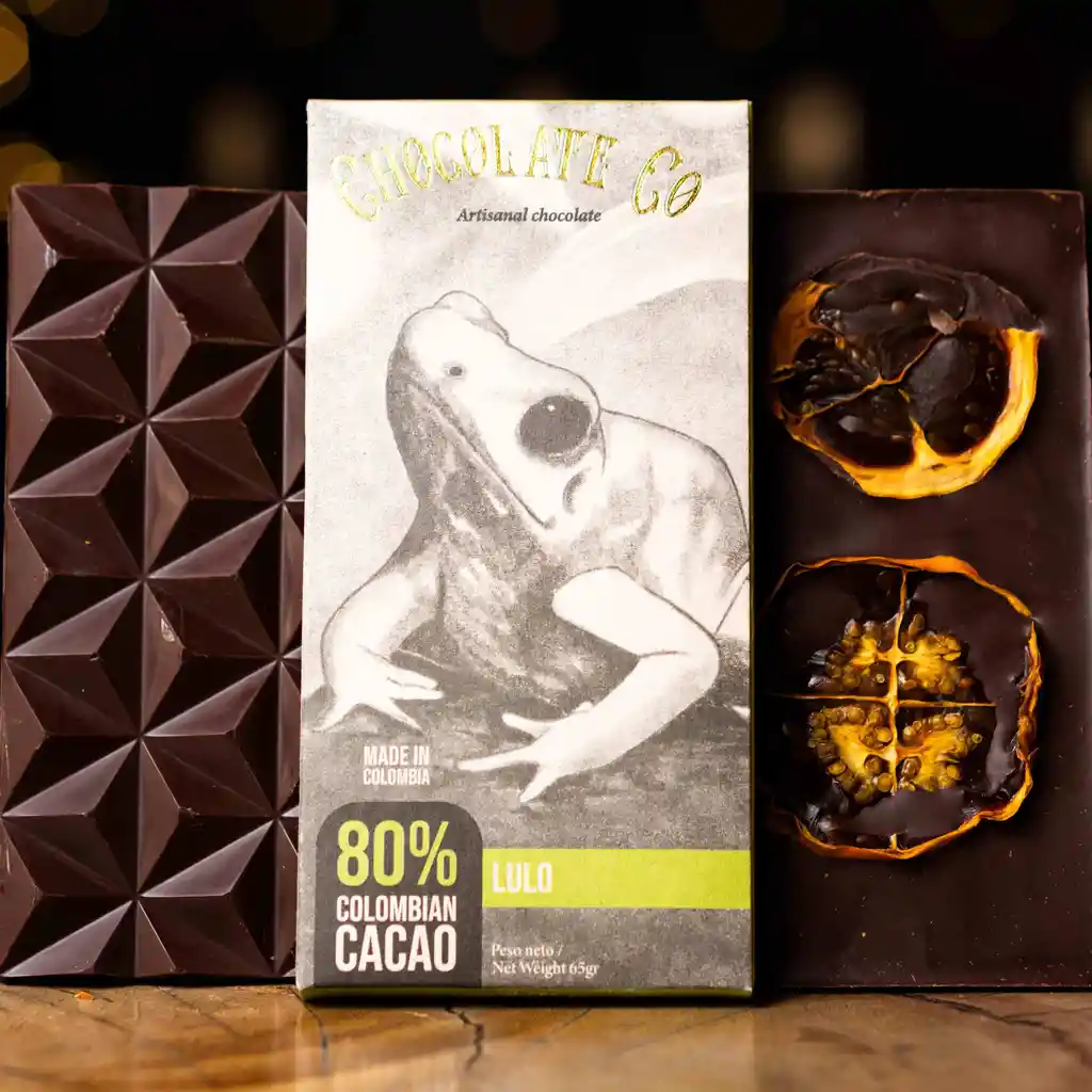 Barra artesanal de chocolate oscuro al 80% con lulo. Hecha con cacao original de los Montes de María.