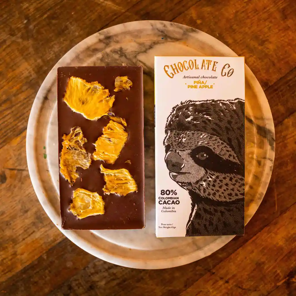 Una tableta de chocolate oscuro al 80% que fusiona la intensidad del cacao con la frescura tropical y el dulzor natural de la piña, logrando un contraste vibrante y exótico.