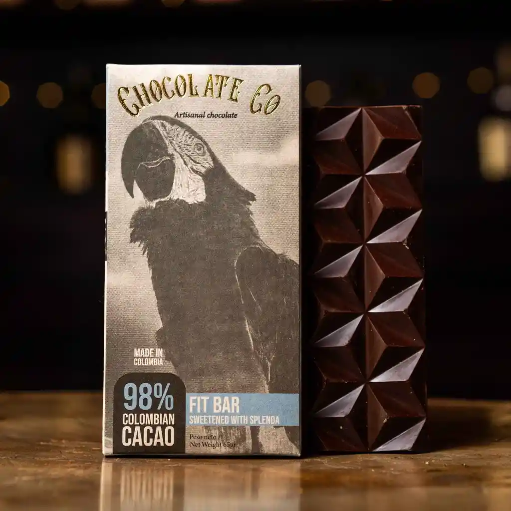 Barra De Chocolate Fit Con Splenda 98% Cacao-Una barra extremadamente intensa, elaborada con cacao fino de aroma al 98%, pensada para paladares que buscan la máxima pureza del grano. Endulzada sutilmente con Splenda® (sucralosa), ofrece un perfil bajo en calorías y sin azúcar añadido, manteniendo la fuerza auténtica del cacao.