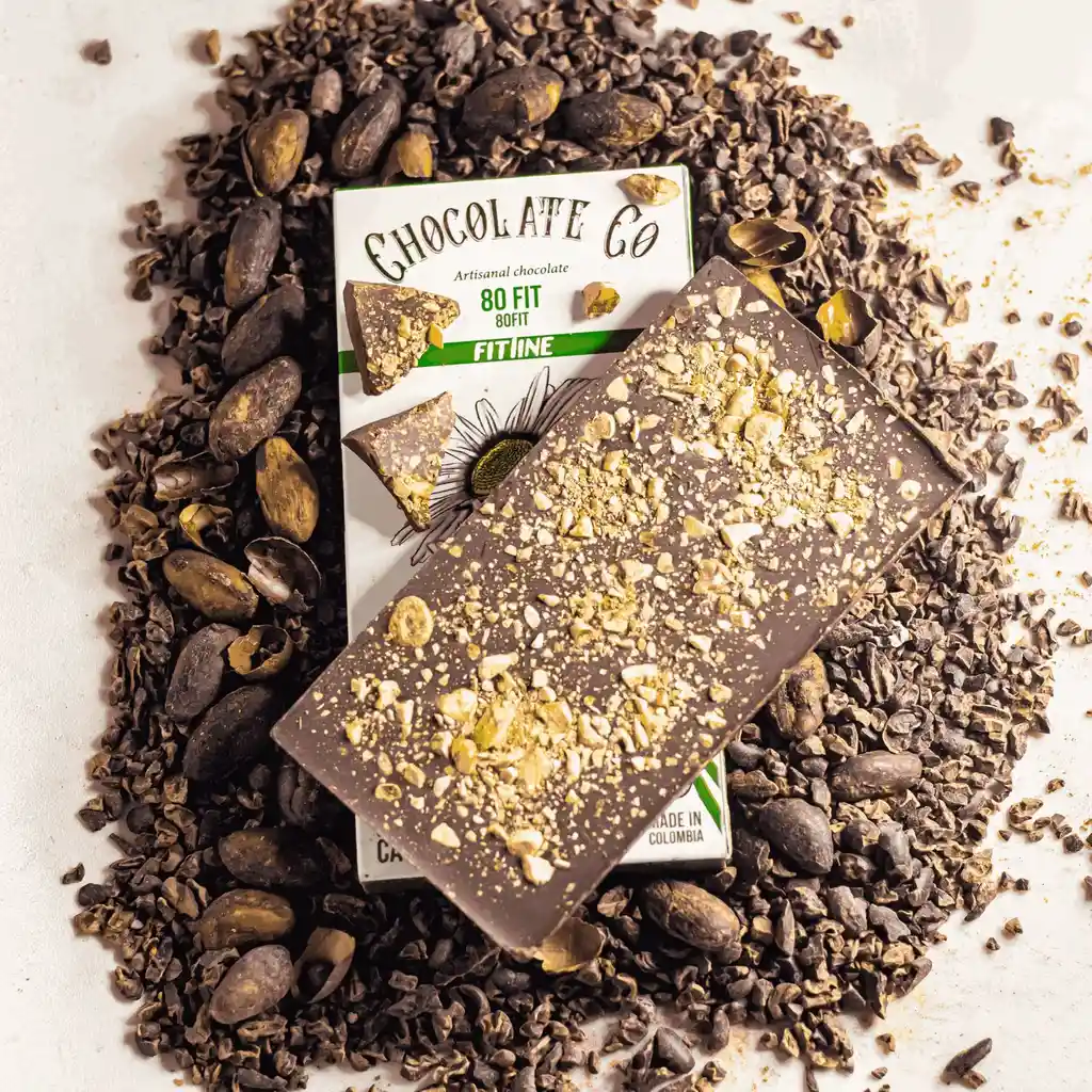 Barra de chocolate oscuro 80% cacao con pistacho, que combina la intensidad del cacao fino de aroma con la textura cremosa y el sabor delicado de este fruto seco. Un chocolate fit, ideal para quienes buscan una barra de chocolate con alto contenido de cacao, perfil intenso y un toque saludable.