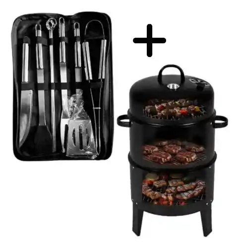 ¡Disfruta del auténtico sabor del asado al carbón con este combo parrillero completo D-tech Ideal para quienes aman compartir momentos únicos en familia o con amigos, este set 3 en 1 te permite asar, ahumar y hornear con resultados profesionales. Este combo incluye el potente Barril BBQ Multifuncional + un kit de 6 herramientas de acero inoxidable con estuche, todo lo que necesitas para tus parrilladas en un solo paquete. Ventajas y características destacadas: 3 funciones en 1 Con su diseño multicapa puedes asar, ahumar o usar como horno, adaptándose a cualquier tipo de preparación. Tamaño ideal y portátil Altura de 80 cm y diámetro de 40 cm. Compacto, pero con gran capacidad. Perfecto para terrazas, patios o viajes. Termómetro incorporado Controla la temperatura interna sin necesidad de abrir el barril. Ventilación superior ajustable Controla el flujo de aire para cocinar de forma uniforme y mantener el sabor. Parrillas cromadas resistentes Mayor durabilidad, fácil limpieza y mejor cocción por contacto directo. Incluye kit parrillero de 6 piezas Tenazas, espátula, cuchillo, brocha, pinchos, cepillo y más, todo en un estuche compacto de 38 x 24 cm, ideal para transportar y mantener organizado. Materiales resistentes al calor y al óxido Diseñado en acero de alta durabilidad para soportar altas temperaturas sin deteriorarse. Fácil de limpiar y montar Desarmable por capas y con puertas laterales de acceso rápido. Perfecto para: Fiestas al aire libre, reuniones familiares, camping, días de campo, negocios de comida o simplemente para quienes disfrutan del verdadero sabor del asado. Envío gratis a todo el país