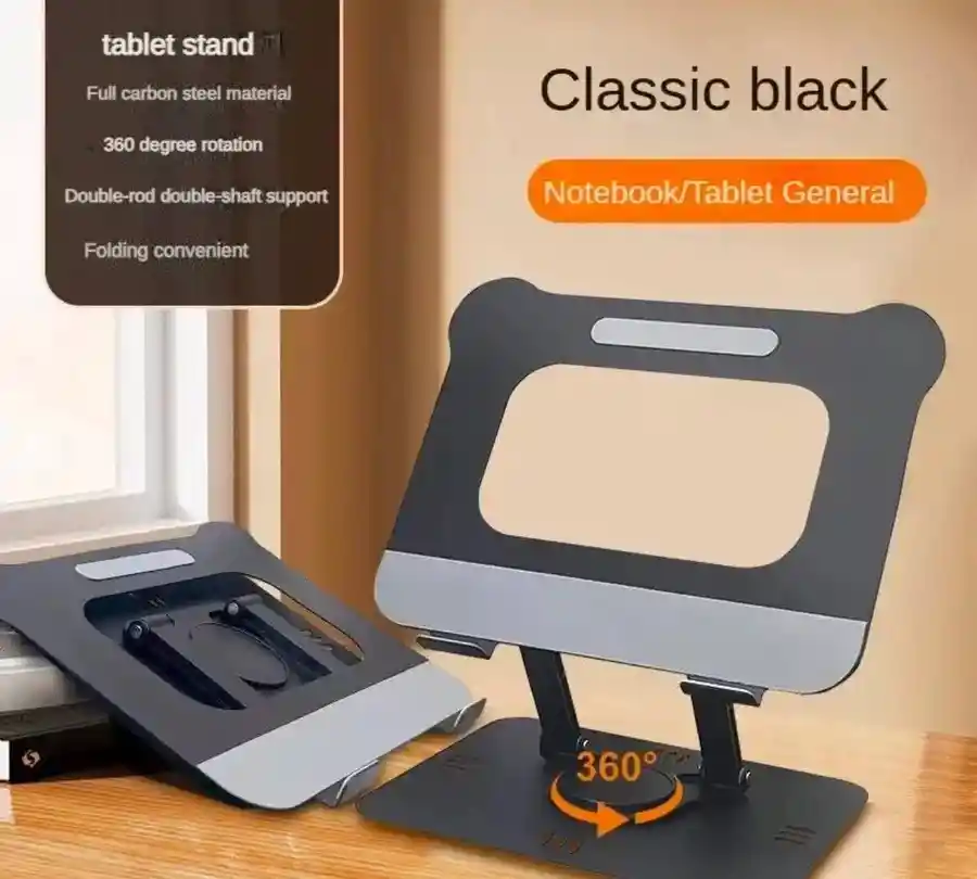 Base Metálica 360 Para Portátil Y Tablets Color: Negro Adecuado para computadoras, portátiles o tablets Fabricado en metal de acero muy resistente. Portátil y ajustable en altura para trabajar y estudiar cómodamente. Soporte para portátil y tableta Metal duradero y resistente a la oxidación reforzado con silicona. Y también un giro de 360 grados. Según tus necesidades Su altura se puede ajustar según se desee para estudiar y trabajar cómodamente sin fatiga. Plegable, portátil y fácil de guardar en bolsas.
