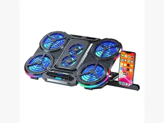 es un soporte de ventilación avanzada diseñado para portátiles de hasta 17 pulgadas, equipado con seis ventiladores y un sistema de iluminación RGB decorativo