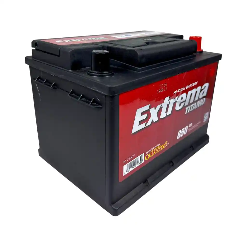 Batería automotriz EXTREMA TITANIO de 12V con 850 amperios. Línea reforzada para trabajo exigente. Proporciona potencia estable y desempeño confiable en el uso diario.