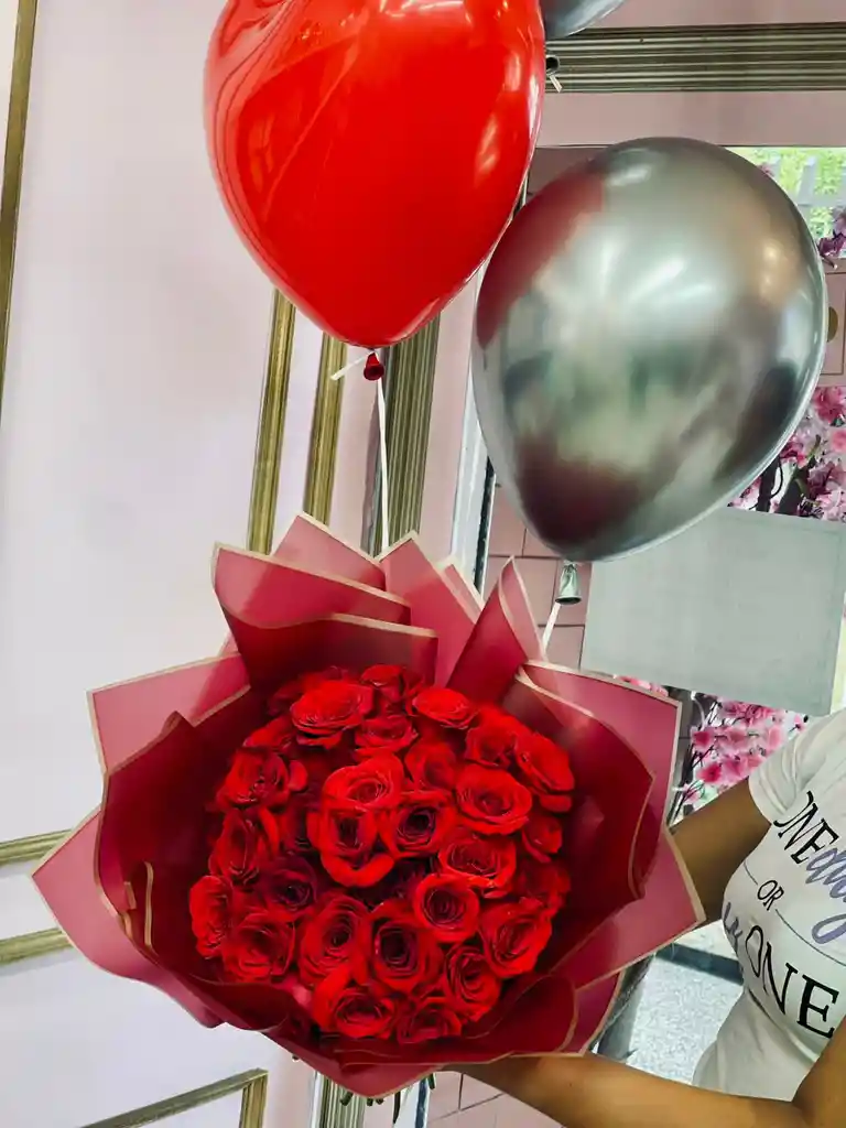 Ramo de rosas x 24 en papel coreano, 2 globos en helio