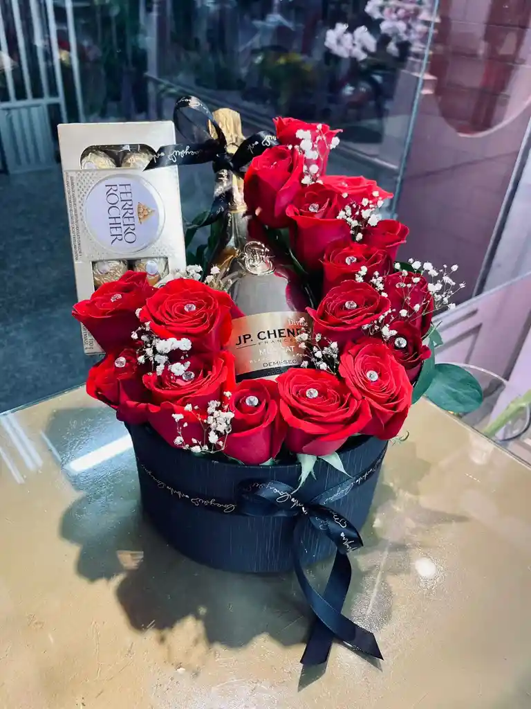 Caja de rosas, caja de chocolates, botella de jp. chenet