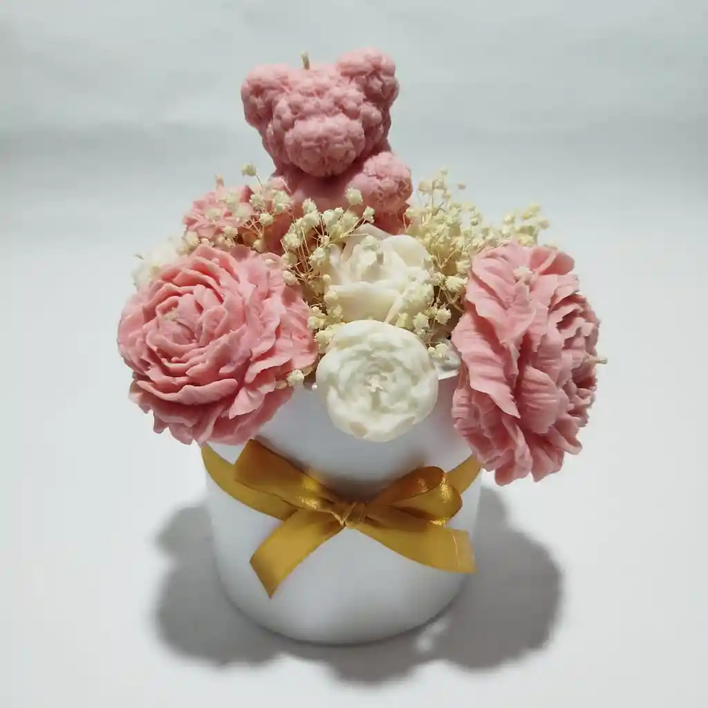 Bouquet artesanal compuesto por 1 vela de osito texturizado, 1 peonia grande , 2 peonia mediana , 1 peonia pequeña ,6 flores pequeñas surtidas. Viene en elegante caja cilindrica de color blanco con cinta de color dorado.Especial para cumpleaños , dia de madres , detalle romantico. Aroma :Sandia