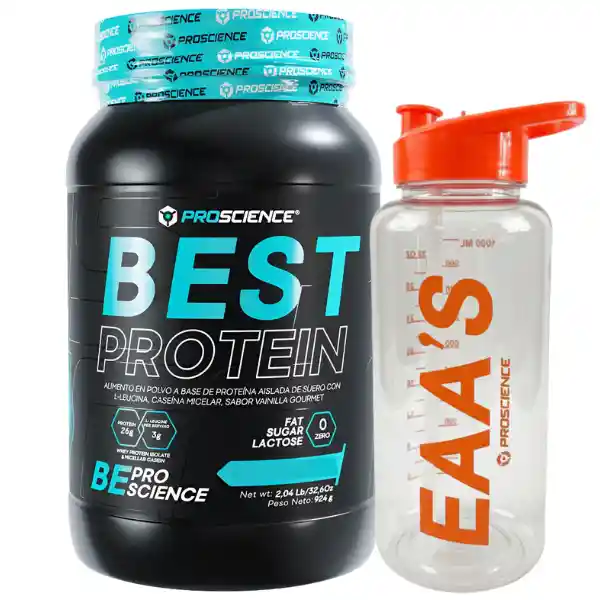 COMBO Best protein Vainilla (2lbs) + OBSEQUIO TERMO! ¿Para qué sirve este trio de best protein? La proteína aislada de suero: De acuerdo a estudios realizados, demuestran que el consumo ayuda al aumento de masa muscular, a la pérdida de grasa corporal entre otras cosas, también beneficiosas para la salud. Best protein contiene caseína micelar: Es una proteína de absorción lenta, que además es anti catabólica, ayuda a reducir la pérdida de masa muscular durante periodos poco consumo de calorías y finalmente ayuda a controlar la ingesta en periodos o definición, durante descansos nocturno. Y finalmente contiene L-Leucina: Aminoácido que ayuda para la síntesis de proteína, también ayuda en la degradación del tejido muscular y el anabolismo muscular. Adicional también tiene vitamina b6 (piridoxina), vitamina b1 (tiamina), vitamina D3 y vitamina c. ¿Cómo consumirlo? Se sugiere mezclar 1 cuchara (33 g) del producto, en 180 ml de agua, si la desea mezclar en leche (aumenta las calorías), agitar hasta obtener un producto homogéneo, consuma una vez esté preparado. Cada servicio de te aporta 26 gramos de proteína y 3 gramos de leucina. No contiene grasa, azúcar, carbohidratos ni lactosa. Contiene aproximadamente 35% de caseína micelar.