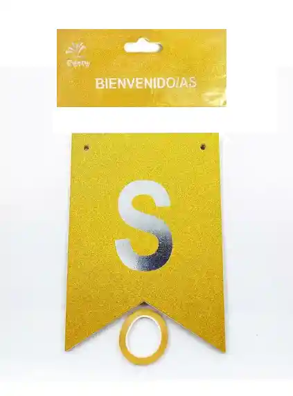 Paquete de 12 banderines con las letras BIENVENIDOAS. Incluye la letra A para usar en femenino y en masculino. En singular: Bienvenido, Bienvenida En plural: Bienvenidos, Bienvenidas El letrero es color dorado escarchado y las letras son en color plateado metalizado Cada banderìn mide 16.5 cm x 11.5 cm aproximadamente