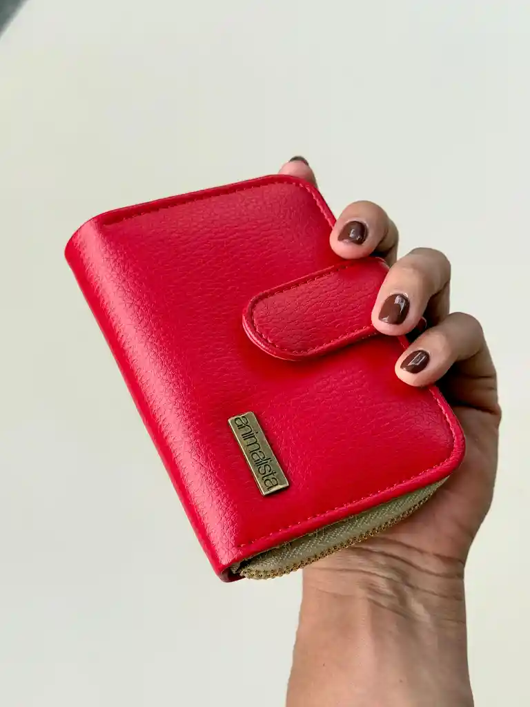 Billetera compacta en color rojo vibrante, elaborada en cuero vegano de alta resistencia. Su diseño práctico incluye cierre metálico y broche de seguridad para mantener todo en orden. Ideal para llevar tarjetas, billetes y monedas de forma organizada. Un accesorio versátil que combina estilo, funcionalidad y conciencia sostenible. billetera roja mujer, cuero vegano, billetera compacta, accesorio sostenible.