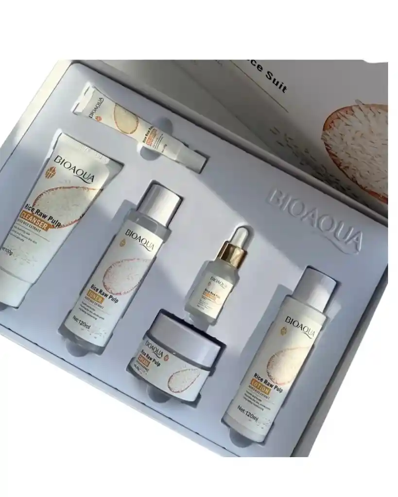 El extracto de arroz es un ingrediente excelente si deseas igualar el tono de tu piel y atenuar manchitas y cicatrices, llevarás el combo completo que incluye lo siguiente: Incluye: - 1 Jabón Facial Arroz 100g. - 1 Contorno de Ojos Arroz Bioaqua 25g. - 1 Serum Facial Arroz Bioaqua 15ml. - 1 Tónico Facial Arroz Bioaqua 120ml. - 1 Loción Facial Arroz Bioaqua 120ml. - 1 Crema arroz Bioaqua 50g Modo de Uso Diario: Paso 1: Lavar el rostro. Paso 2: Aplique el tónico facial. Paso 3: Aplique la loción facial Paso 4:Aplique el serum Facial. Paso 5: Aplique el contorno de ojos. Paso 6: Por ultimo aplique la crema hidratante.