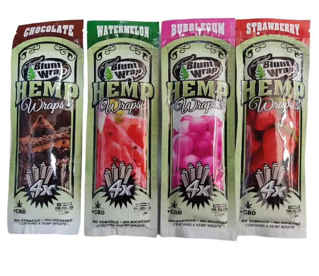 Blunt wrap hemp es un papel homogeneizado 100% natural totalmente vegano, con sabor a frutas o bebidas refrescantes, una experiencia única para sentir los aromas y sabores de alta calidad en tu paladar, así mismo una forma de aromatizar tu entorno cuando fumas. Sobre Blunt Hemp X4 unidades + CBD + 4 Filtros. Es empacado al vacío y con paquete resellable, cuenta con 4 envoltorios para rolar, dispuestos en forma de espiral, hechos a base de HEMP(cáñamo), con CBD, completamente libres de tabaco y nicotina.