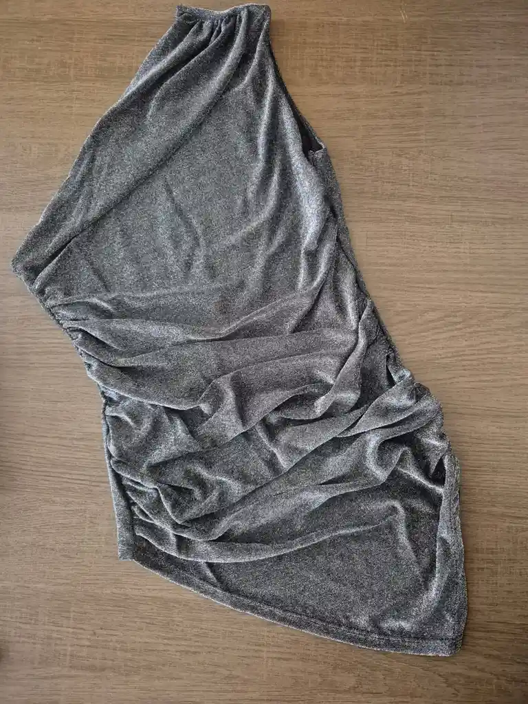 Blusa asimétrica, un hombro, tela brillante, talla única, color gris.