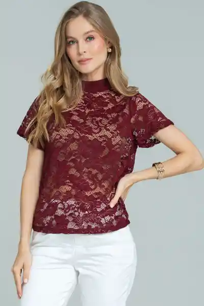 En Blonda Fondo Entero Cuello Alto Con Sesgo Elástico y Botones Para Ajuste en Posterior Corte en Centro Espalda Manga Corta Silueta Amplia.