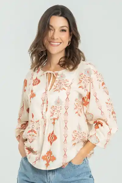 En Chalis Estampado Escote Redondo Con Abertura y Sesgo Amarre Manga Larga Con Puño.