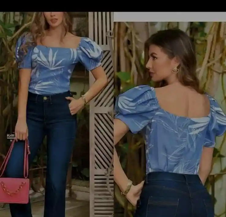HERMOSA BLUSA PARA DAMA CON ESCOTE EN PECHO Y ESPALDA, MANGA TIPO GLOBO, COMBINABLE CON CUALQUIER PRENDA Y ESTILO, FORMAL, ELEGANTE, INFORMAL. TALLA: XL. COLOR: ESTAMPADO AZUL/BLANCO. Producto 100% colombiano, de la marca Ebba & Kritterium.