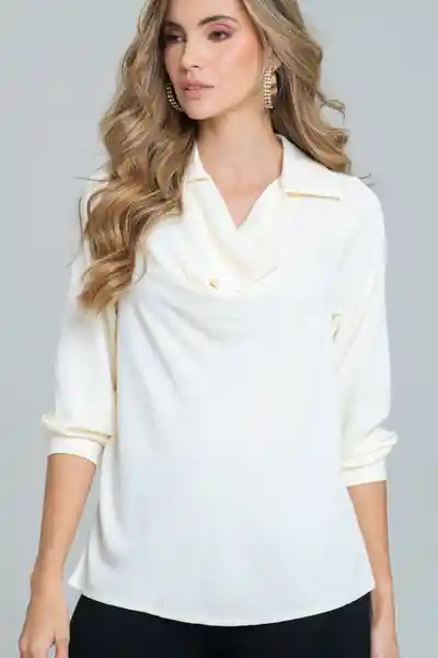 Camisa en tejido plano con acabado especial, cuello camisero, escote drapeado en la parte delantera, manga larga con puño en ruedo con botones 18L, espalda lisa, aberturas de 6cms a lado y lado del ruedo, ruedo de 0.8cms, silueta semi ajustada.