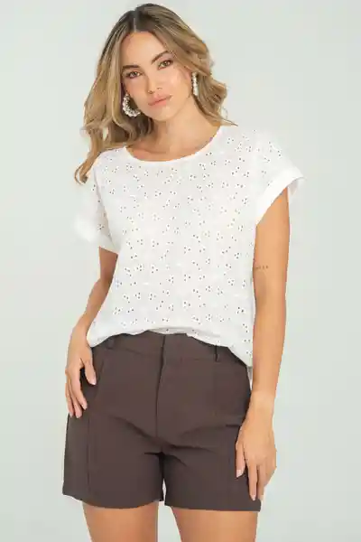 En Tejido Plano Fondo Entero Tipo Ojalillo Escote Redondo Manga Corta Rodada Con Puón de 2 cm Sostenido Con Pespuntes Para Que no se Devuelvan Ruedo de 0.8 mm Silueta Semi Ajustada.