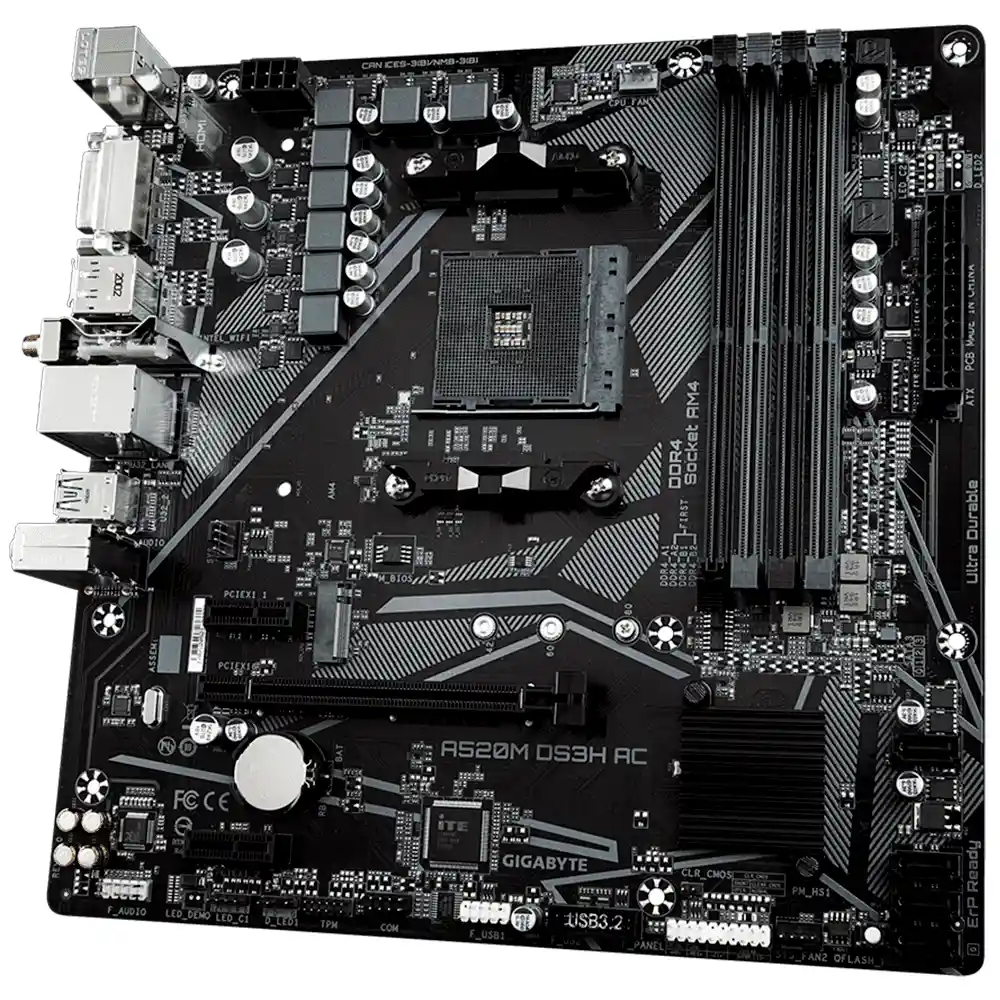 La GIGABYTE A520M DS3H AC está diseñada para ofrecer el mejor rendimiento en sistemas compactos. Compatible con procesadores AMD Ryzen de las series 5000, 5000 G, 4000 G, 3000 y 3000 G, esta tarjeta madre garantiza potencia y versatilidad para tareas de alto rendimiento y uso cotidiano. Con soporte para memoria DDR4 en Dual Channel y capacidad para 4 DIMMs, ofrece una experiencia multitarea fluida y eficiente. Equipada con una solución VRM digital de 5+3 fases y MOSFETs de baja resistencia (Low RDS(on)), la A520M DS3H AC asegura una entrega de energía estable, ideal para mantener el máximo rendimiento del procesador y la memoria bajo cualquier carga. Además, cuenta con un conector M.2 NVMe PCIe 3.0 x4 ultra rápido, optimizado para almacenamiento de alta velocidad. La conectividad inalámbrica es un punto destacado gracias a su módulo Intel Dual Band 802.11ac con Bluetooth 4.2, proporcionando conexiones estables y rápidas para trabajo remoto, gaming o entretenimiento. Adicionalmente, el exclusivo 8118 Gaming LAN de GIGABYTE con gestión de ancho de banda mejora la experiencia en línea al priorizar aplicaciones críticas como juegos y streaming. La compatibilidad con múltiples pantallas es otro punto fuerte, ofreciendo salidas HDMI, DVI-D y DisplayPort para configuraciones de video versátiles y de alta calidad. Con RGB FUSION 2.0, puedes personalizar tu sistema con tiras LED RGB direccionables y no direccionables, llevando la estética de tu PC a otro nivel. Smart Fan 5 con múltiples sensores de temperatura y conectores híbridos para ventiladores garantiza un sistema fresco y silencioso, incluso en sesiones de uso prolongado. La función de FAN STOP permite detener los ventiladores cuando no son necesarios, maximizando la eficiencia energética. Finalmente, Q-Flash Plus facilita actualizaciones de BIOS rápidas y sencillas, incluso sin necesidad de instalar el procesador, la memoria o la tarjeta gráfica. La GIGABYTE A520M DS3H AC es la solución perfecta para quienes buscan rendimiento, conectividad avanzada y una configuración personalizada en un formato compacto. Especificaciones: Procesador Series 5000 / 5000 G-Series Series 4000 G-Series Series 3000 / 3000 G-Series Chipset: AMD A520 Memoria 4 ranuras DDR4 DIMM, hasta 128 GB (capacidad máxima de 32 GB por módulo). Arquitectura de memoria Dual Channel. Gráficos DVI-D: Máx. resolución de 1920x1200@60 Hz. DisplayPort: Máx. resolución de 5120x2880@60 Hz (versión 1.4, HDCP 2.3, HDR). HDMI: Máx. resolución de 4096x2160@60 Hz (versión 2.1, HDCP 2.3, HDR). Audio Codec de audio Realtek de alta definición. Configuración de 2/4/5.1/7.1 canales. (Para 7.1, es necesario configurar el software de audio). LAN y Comunicación Inalámbrica LAN: Realtek GbE (1 Gbps). Módulo inalámbrico (según la revisión del PCB): Intel Dual Band Wireless-AC o AzureWave Wi-Fi. Soporte para Wi-Fi 802.11ac (2.4/5 GHz). Bluetooth 4.2, 5.0 o 5.1 (según revisión). Puertos de Expansión CPU: 1 ranura PCI Express x16 (PCIe 3.0, x16). Chipset: 2 ranuras PCI Express x1 (PCIe 3.0). Interfaz de Almacenamiento CPU: 1 conector M.2 (NVMe PCIe 3.0 x4/x2 y SATA). Chipset: 4 conectores SATA 6Gb/s. USB CPU: 4 puertos USB 3.2 Gen 1 en el panel trasero. Chipset: 2 puertos USB 3.2 Gen 1 (mediante encabezado interno). 4 puertos USB 2.0/1.1 (2 en el panel trasero, 2 mediante encabezado interno). Conectores Internos de E/S 1 conector ATX de 24 pines y 1 de 8 pines para alimentación. 1 conector M.2, 4 conectores SATA. Encabezados para ventiladores, tiras LED RGB, audio frontal, USB, entre otros. Botón Q-Flash Plus para actualizar el BIOS fácilmente. Conectores del Panel Trasero 1 puerto PS/2 (teclado/ratón). 1 puerto DVI-D, 1 DisplayPort, 1 HDMI. 2 conectores SMA para antenas Wi-Fi. 4 puertos USB 3.2 Gen 1, 2 USB 2.0/1.1. 1 puerto RJ-45. 3 conectores de audio. Formato Micro ATX (24.4 cm x 24.4 cm) Garantía. 12 Meses