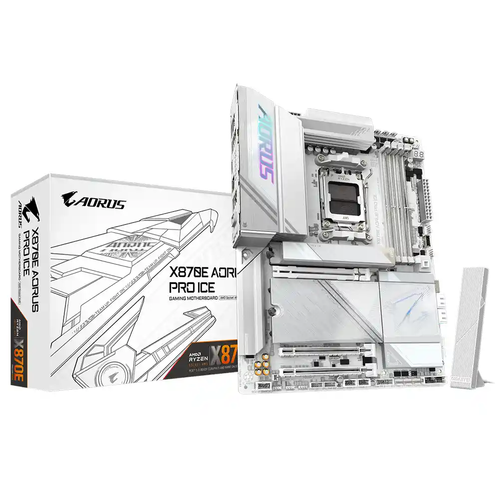 X870E AORUS PRO ICE: Estética Impecable y Rendimiento Élite ❄️ Diseñada para los procesadores AMD Ryzen™ series 9000, 8000 y 7000, esta tarjeta madre combina un diseño visualmente impactante con el chipset X870E para ofrecer el máximo ancho de banda disponible. Socket: AMD AM5 preparado para procesadores Ryzen™ de última generación Conectividad: Wi-Fi 7 de ultra alta velocidad y doble puerto USB4® (40 Gbps) Energía: Sistema digital de 16+2+2 fases (80A) para un overclocking estable Almacenamiento: 4 ranuras M.2, incluyendo 3 con soporte PCIe 5.0 x4 Diseño DIY: Sistemas EZ-Latch Plus y Click para instalar GPU y SSD sin tornillos Garantía: 36 meses (3 años)