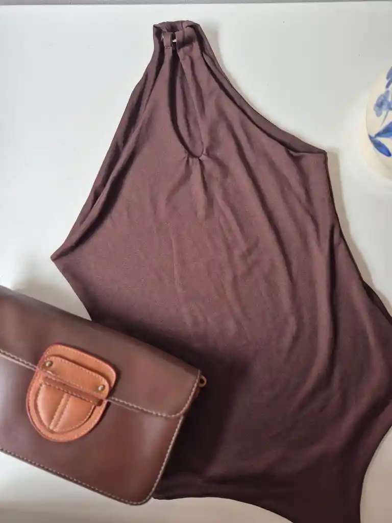 Body asimétrico, un hombro con herraje, talla única color chocolate.