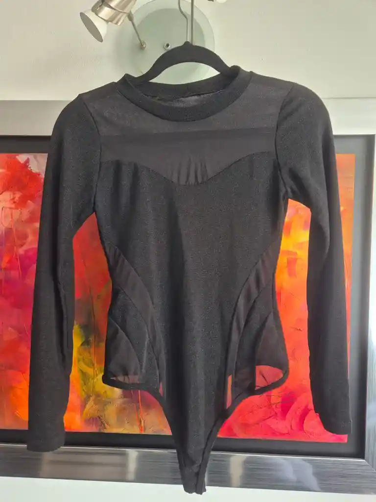 Body manga larga cuello alto con transparencia brillante. Talla única color negro.