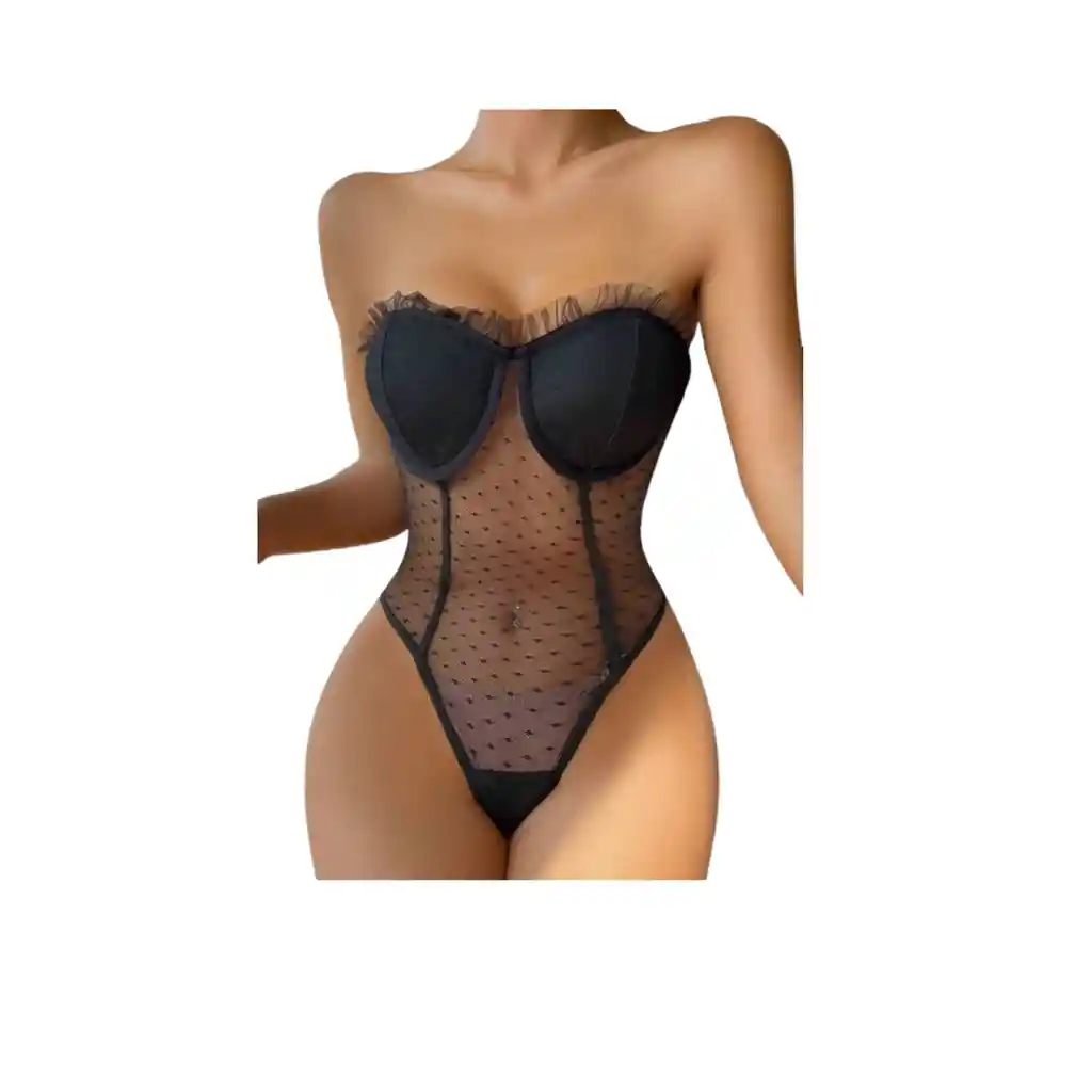 Body Negro Transparente Strapless – Sensualidad & Estilo Este espectacular body negro strapless combina la sensualidad del encaje transparente tipo malla con un diseño moderno que realza la figura. Su copa estructurada ofrece mayor soporte y definición, mientras que el detalle de volantes suaves en la parte superior aporta un toque delicado y femenino. La malla con puntos sutiles moldea la silueta y crea un efecto visual estilizado, haciendo que la cintura se vea más marcada. Su diseño de tiro alto alarga las piernas y resalta las curvas de manera perfecta. Ideal para noches especiales, sesiones de fotos, outfits atrevidos o para combinar con jeans y blazer para un look chic y seductor. talla xs
