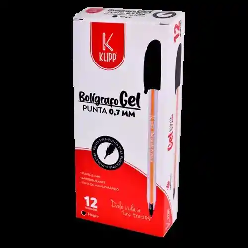 Bolígrafo de gel negro con tapa, punta fina de 0.7 mm en caja de 12 unidades. Ofrece una escritura suave y precisa con tinta resistente a la decoloración.