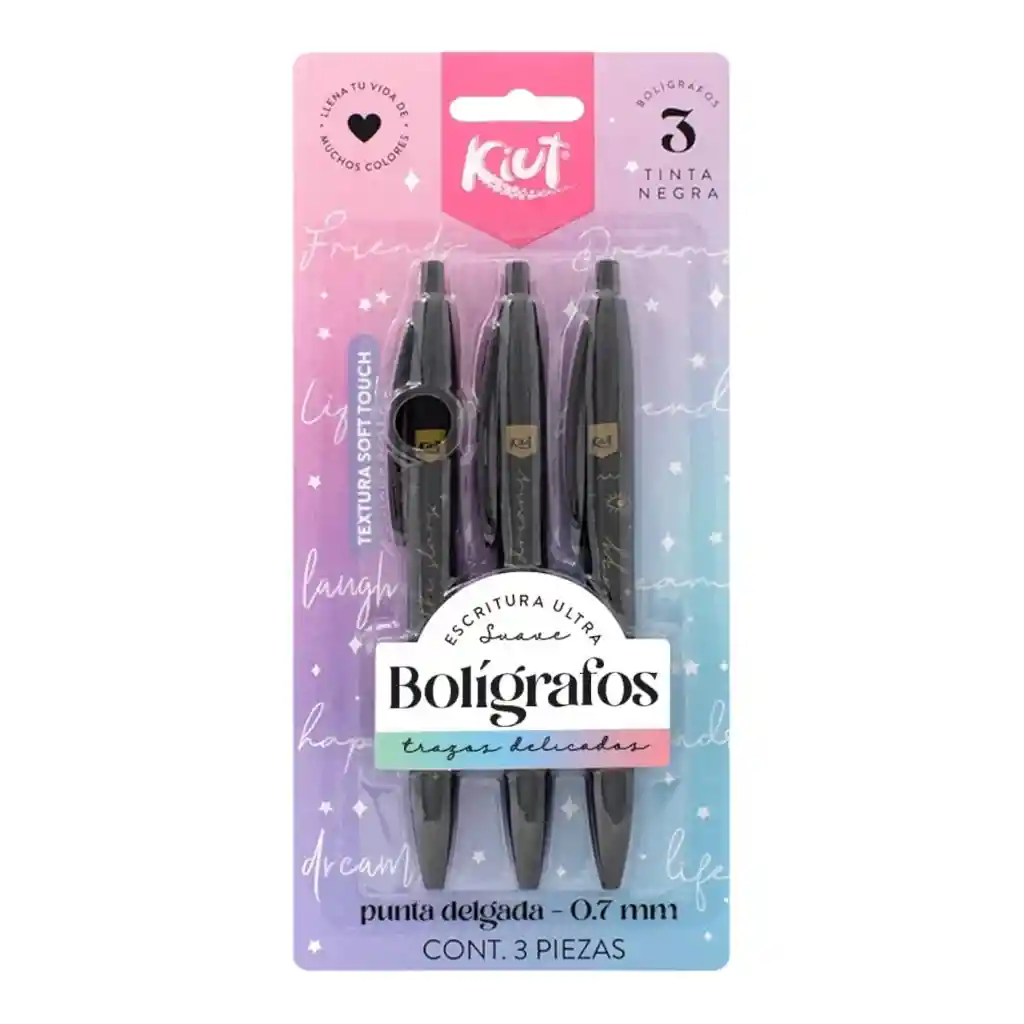*¡Ahora tus notas tendrán el mejor estilo! Los nuevos bolígrafos Kiut te ofrecen trazos suaves, delicados y continuos. *Son retractiles y prácticos para usar. *Tienen punta de 0,7 mm para una escritura delicada. *Su diseño es super lindo y trae frases inspiradoras. *Su cuerpo con textura soft touch es muy suave y fácil de sujetar para mayor comodidad en los trazos. Especificaciones *Producto Especial:Detalles Exclusivos ,Ideal Para Planear, Infaltable Para llevar en la Cartera, Perfecto Para Regalo. *Marcas:Kiut. *Altura:20,833cm. *Ancho:9,9cm. *Longitud:1,167cm. *Tipo de Producto:Bolígrafos, Escritura kiut, Escritura Norma.