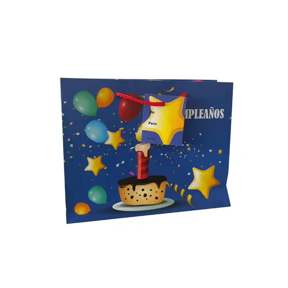 Medidas: 22.5 x 8 x 18 cm Tarjeta de/para - Base y laterales reforzados, manija en cordón de colores Fabricadas en papel grueso Si no tenemos en existencia la bolsa que aparece en la foto enviaremos una similar para la ocasión de cumpleaños