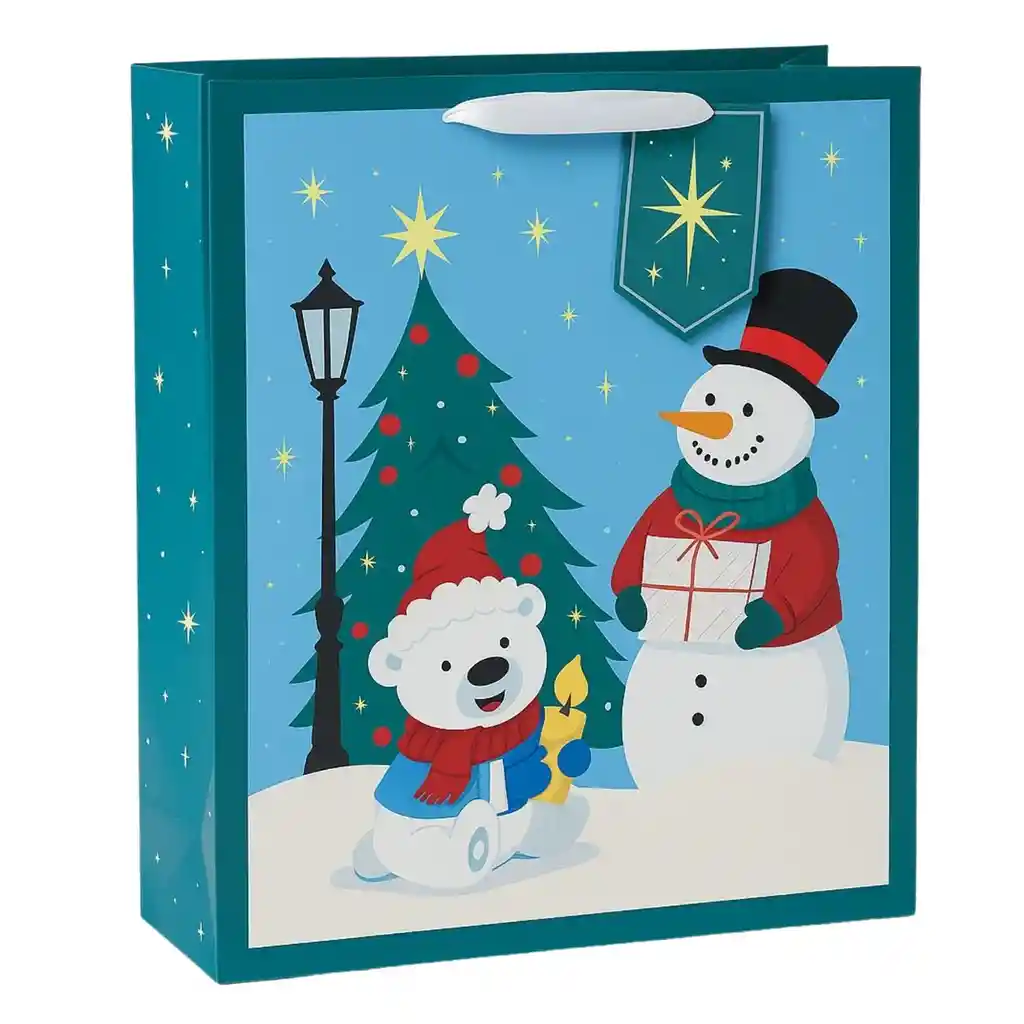 Celebra la magia de la Navidad con esta bolsa de regalo tamaño grande (30 cm de ancho x 38 cm de alto), decorada con una tierna ilustración nocturna que transmite alegría y calidez. El diseño presenta un muñeco de nieve con sombrero de copa y bufanda, acompañado por un osito blanco con gorro y bufanda rojos, ambos sosteniendo regalos frente a un árbol navideño adornado con esferas rojas y una estrella dorada. 🌟 Detalles que enamoran: Fondo azul oscuro con estrellas brillantes y farol navideño Asas de cinta blanca y etiqueta decorativa con estrella Estilo infantil y familiar, ideal para niños y celebraciones cálidas Perfecta para envolver juguetes, ropa, libros o sets navideños